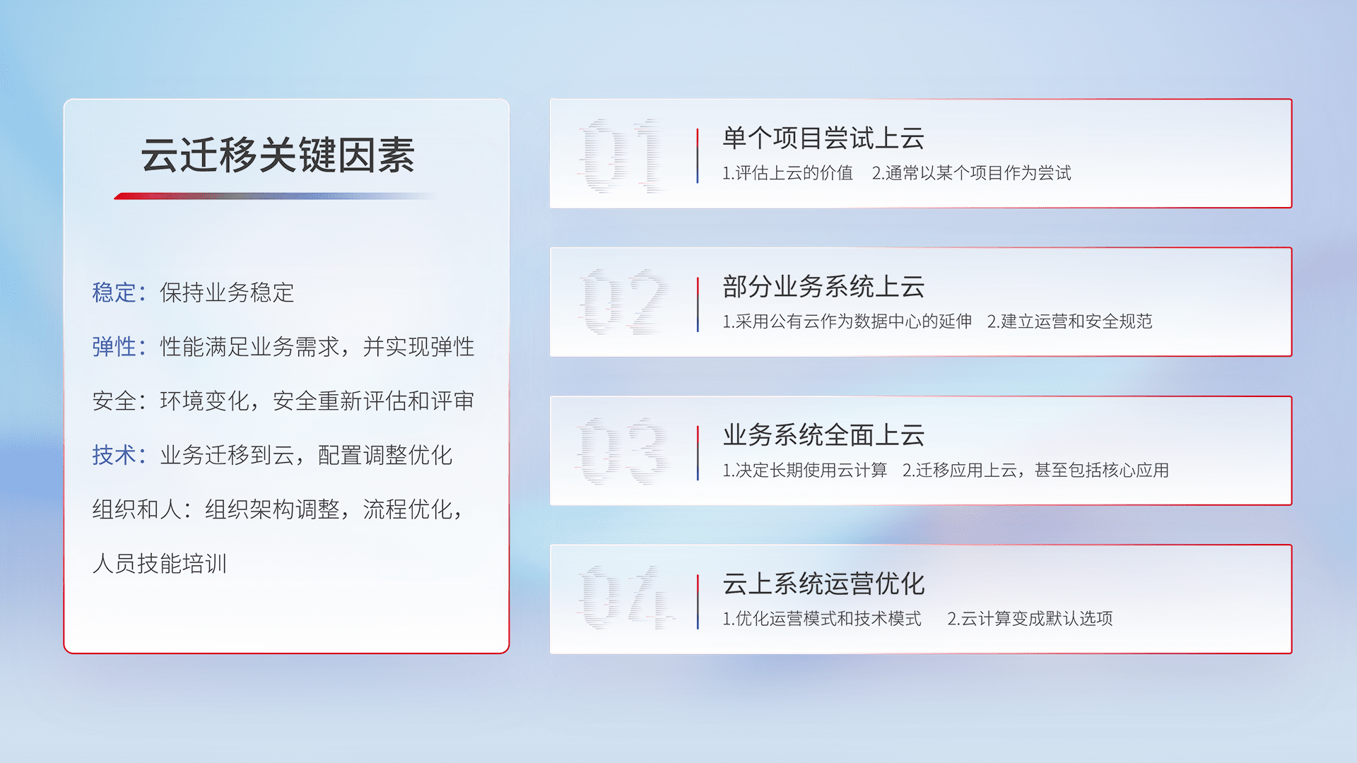 结合实际业务,,,,从规划设计、、、云平台选型、、、云原生改造、、、、数据迁移、、、集成交付,,,迁移全过程为客户识别最佳上云路径,,,做好风险识别管理,,设计网络架构、、、身份权限、、、、安全审计合规、、、、操作审计、、、、日志审计、、、、监控告警策略、、多站点容灾设计等,,对云上基础设施进行整体规划,,,,提升IT治理水平,,,,以满足弹性、、高可用、、、、高性能的需求。。
