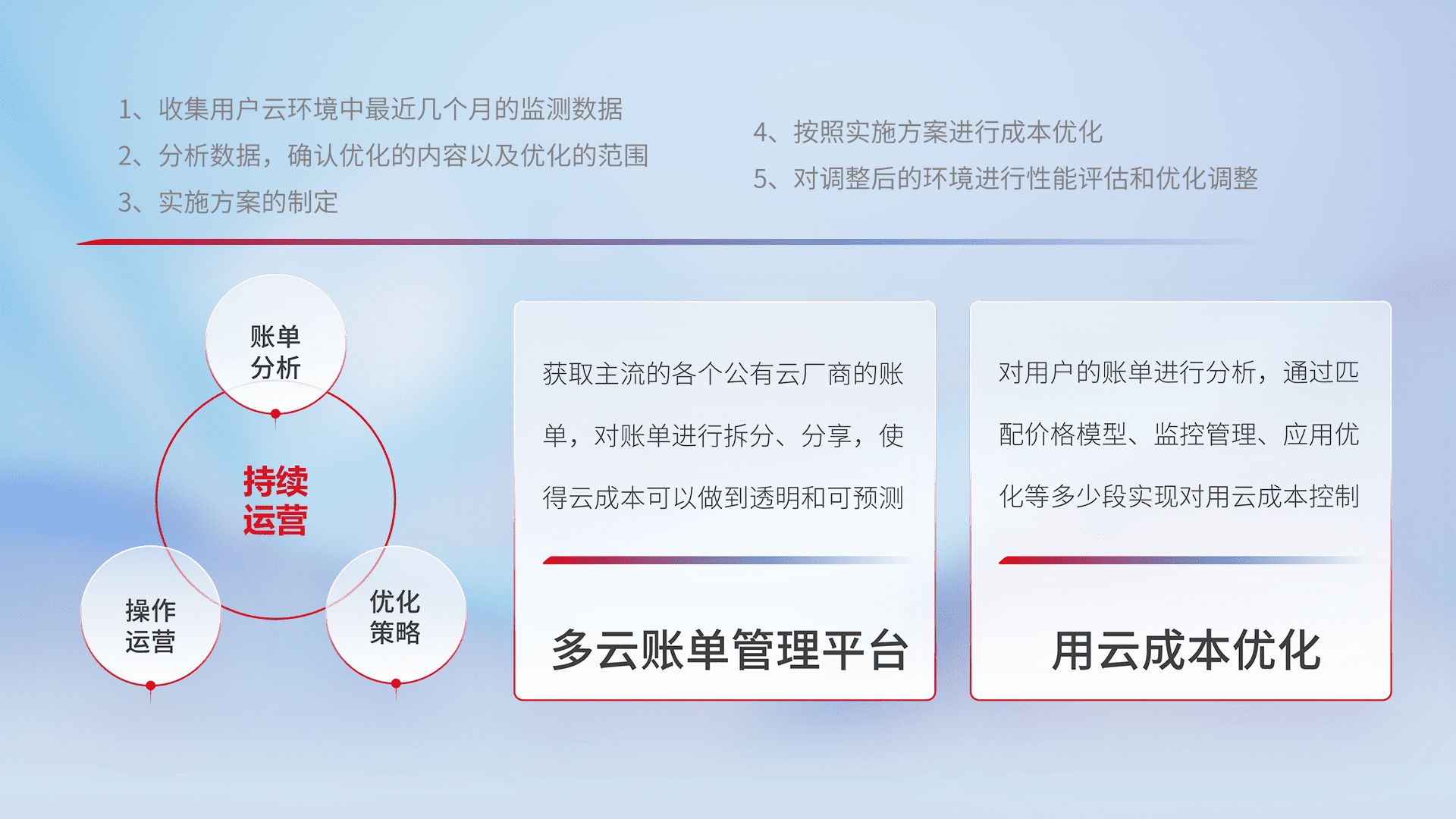 通过多云纳管,,,以统一的资源数据模型把客户的云资源进行抽象和封装,,,,进而实现对多云资源的统一操作,,,保障云资源管理的可靠性、、、稳定性与可用性。。量身定制化运维内容,,,,配置、、开发运维、、、补丁管理、、、备份、、监控、、认证和访问管理、、审计和日常巡检等,,保障在用云过程中的可靠度,,,,稳定度以及高可用率。。。。