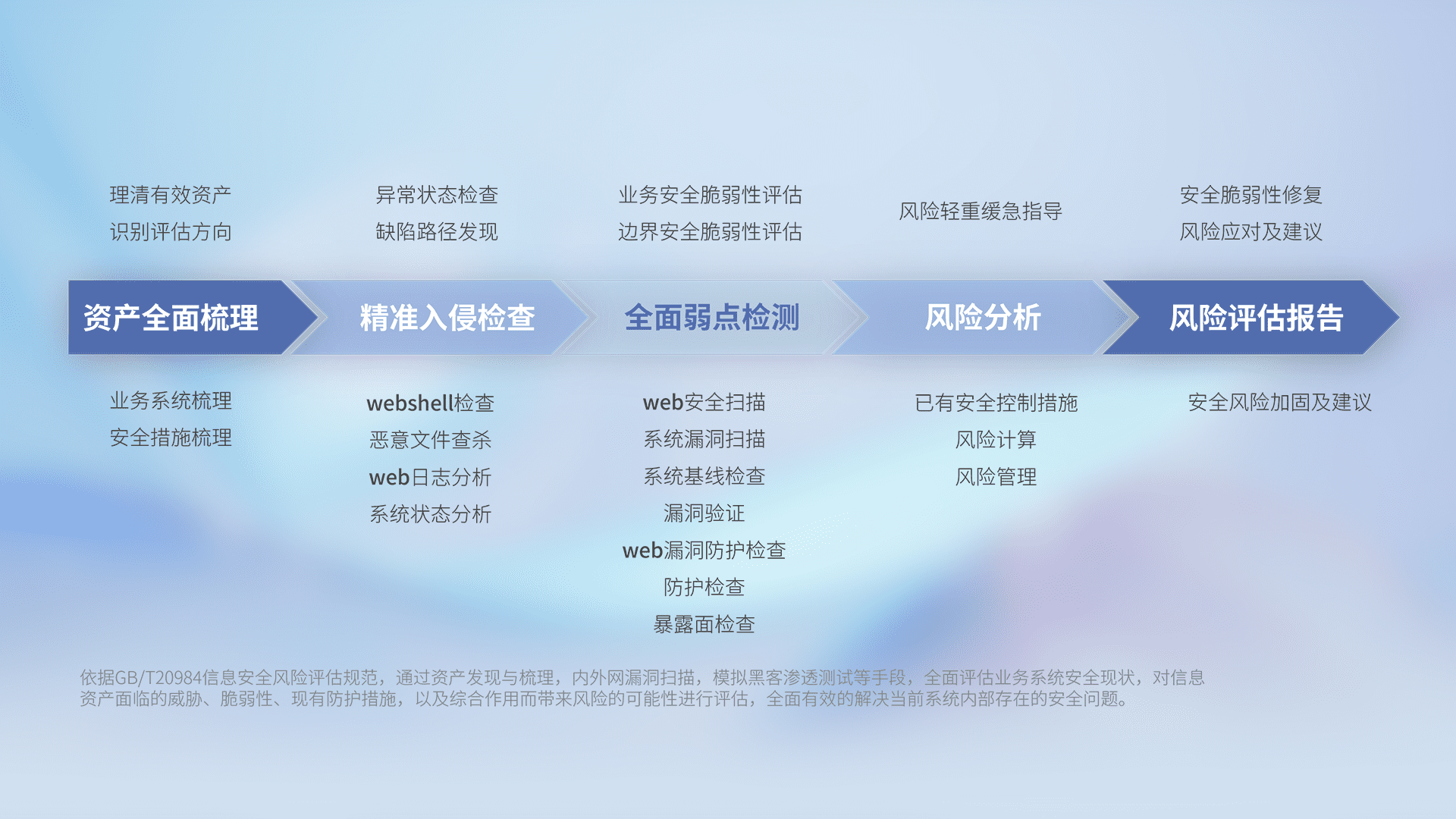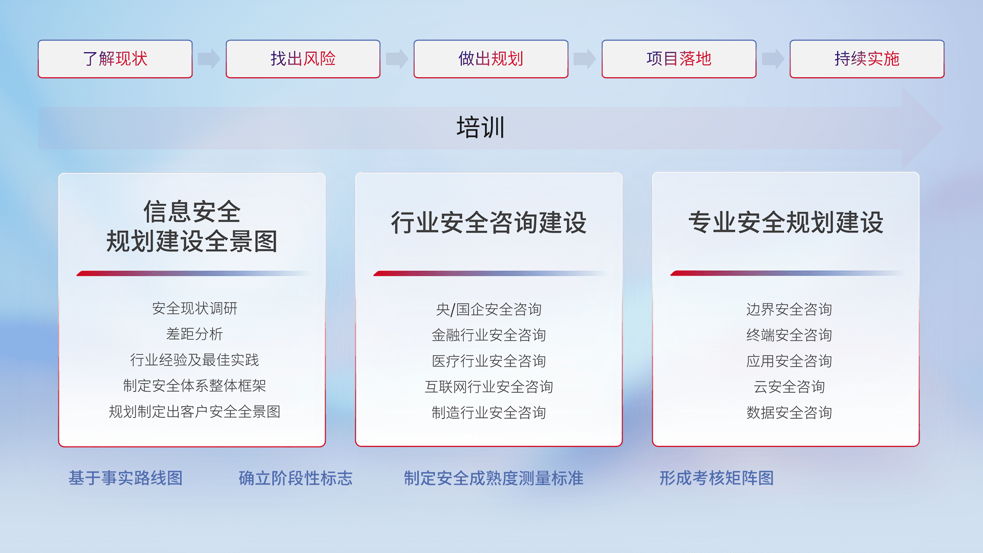 针对客户行业特性,,以专业的安全服务+多厂商联合解决方案提供专属的一站式安全管理服务,,帮助客户全面感知网络空间威胁,,,,基于识别、、检测、、、、分析、、、、防护、、、监测、、响应的服务理论模型,,,,从方案咨询、、集成交付、、、评估验证、、优化加固、、、、运维运营,,,致力于为客户提供完整的闭环管理式安全服务。。以实战经验为客户打造高抵御风险的安全体系,,帮助客户发现威胁、、、对抗威胁、、处置威胁,,,不断积累安全对抗能力,,持续保障数字化安全。。。。